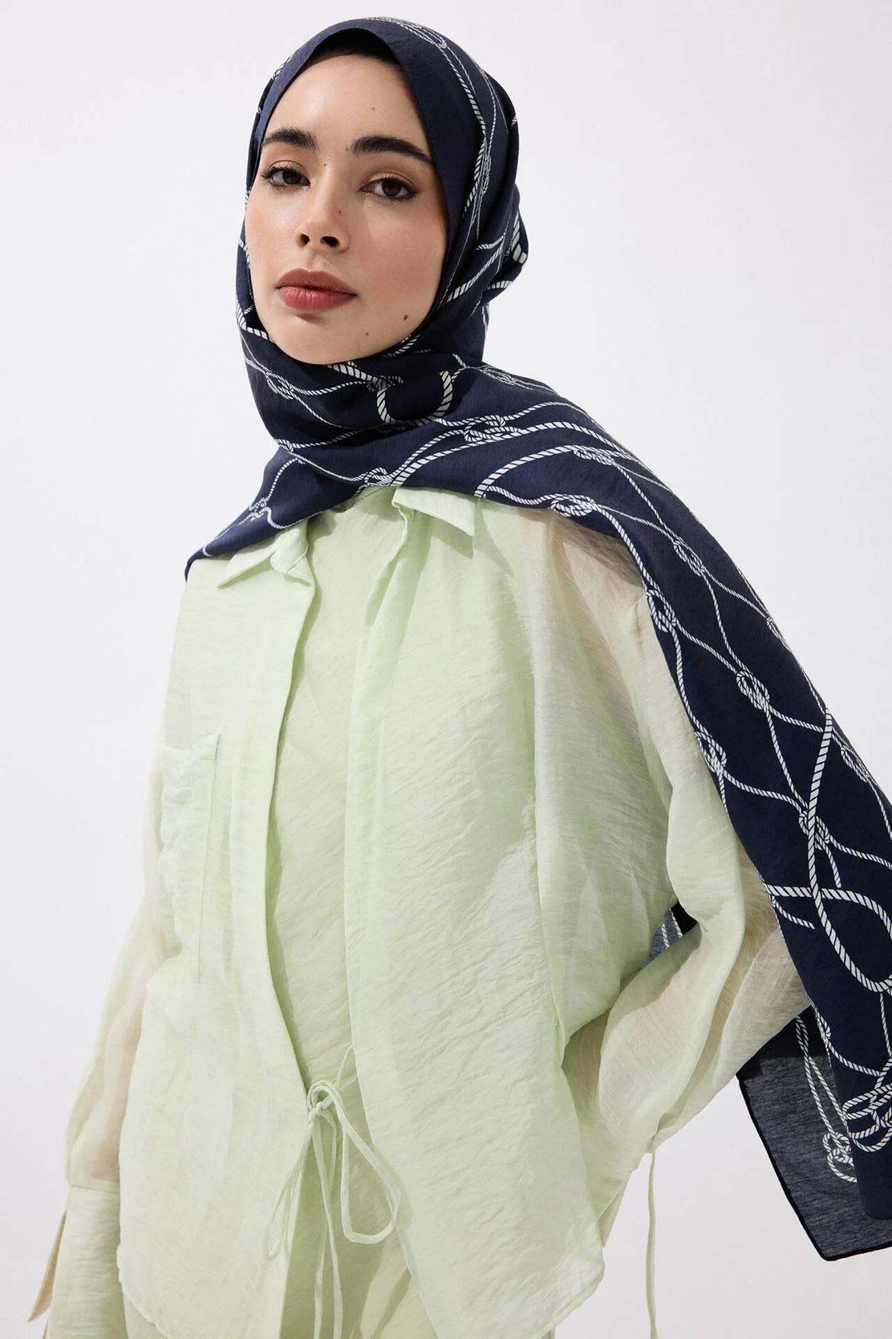Derin lacivert zemin üzerine işlenen halat desenleriyle bu şal, sade ama etkileyici bir stil sunuyor. Minimal ama güçlü duruşu sayesinde ister sokak stiline ister şık bir buluşmaya kolayca uyum sağlar. Modern kadının gardırobuna karakter katan özel bir parça!