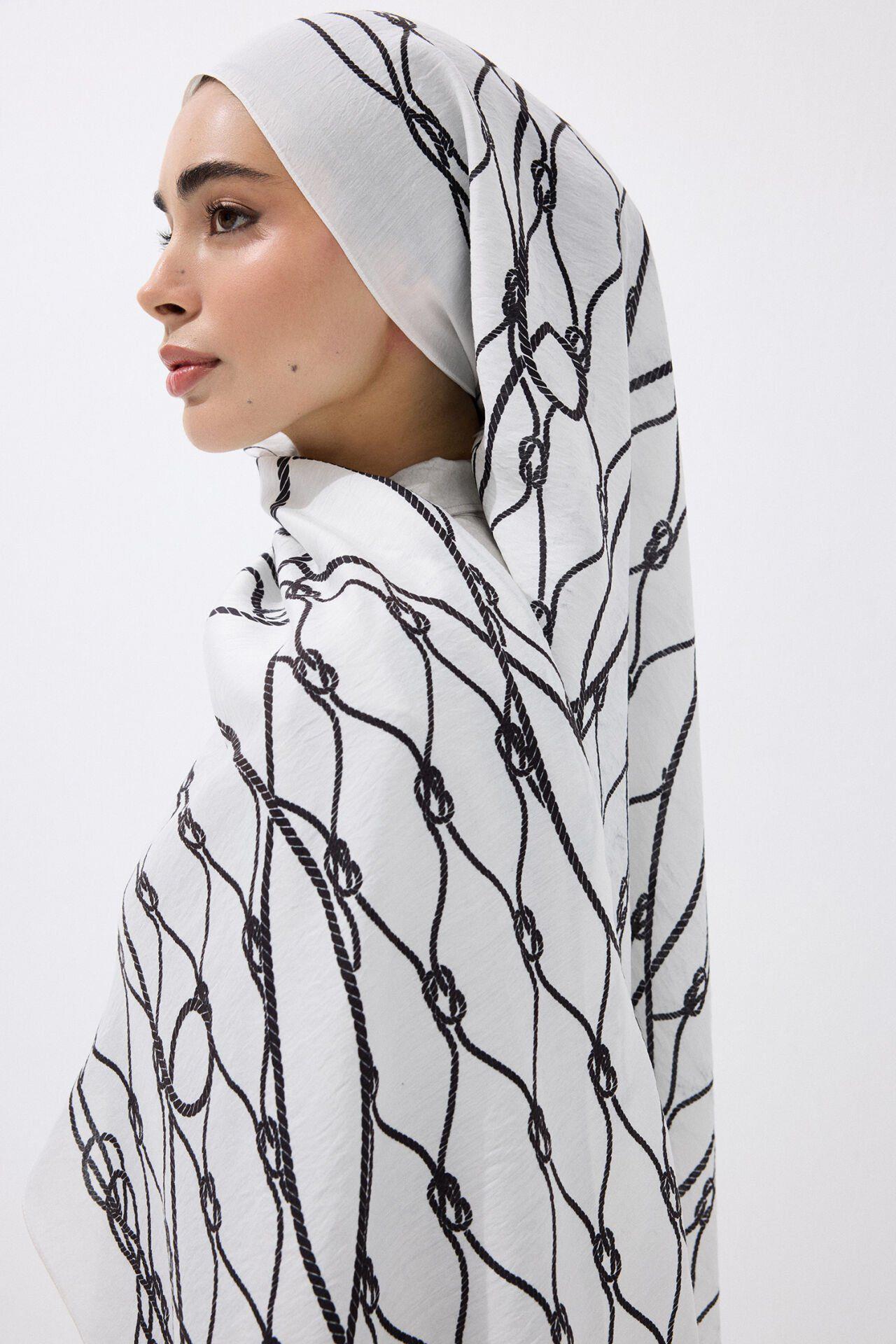 Halat motiflerinin sanatsal bir yorumla buluştuğu bu özel tasarım, geleneksel dokunuşları modern bir estetikle harmanlıyor. Merkezdeki özgün motif, şala karakter katarken; zarif detaylar her kombine sofistike bir hava katıyor. Hem klasik hem günümüz stilleriyle mükemmel uyum sağlayan bu tasarım, gardırobunuzun vazgeçilmezi olacak.