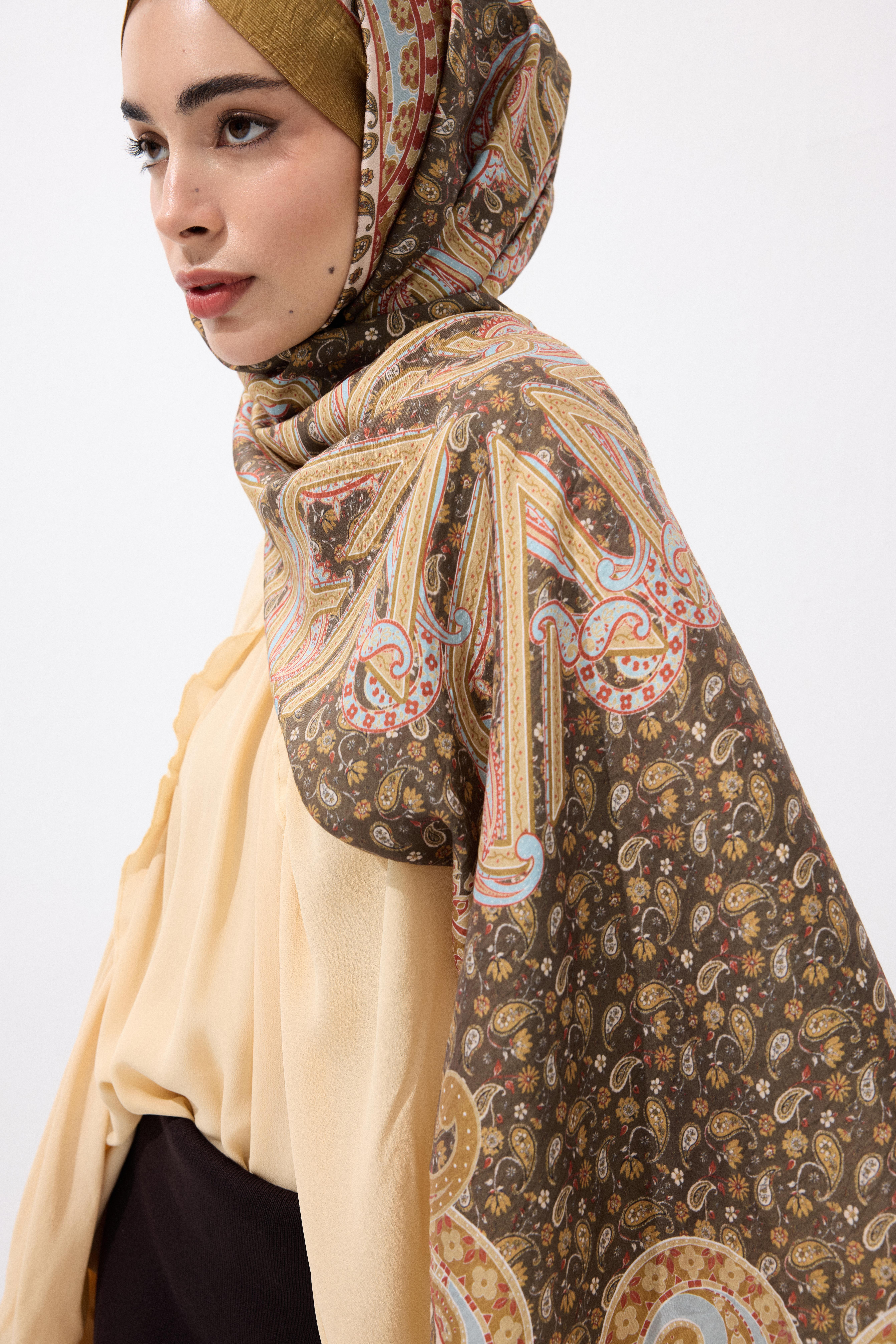 Serenity koleksiyonundan klasik ve modern çizgilerin zarif bir uyumla buluştuğu bu %80 pamuk %20 ipek şal, yumuşak dokusu ve nefes alabilir yapısıyla stilinize incelik katar. Zengin desenleri ve sıcak tonlarıyla her kombininize sofistike bir hava kazandırırken, hafifliği sayesinde gün boyu konfor sunar. Özenle tasarlanan desenleri, sanatsal detaylarla bezenmiş görünümünüzü tamamlar. Hem özel davetlerde hem günlük kullanımda stilinizi bir adım öne taşıyacak bu şal, gardırobunuzun vazgeçilmezi olmaya aday.